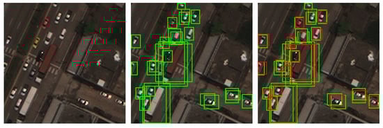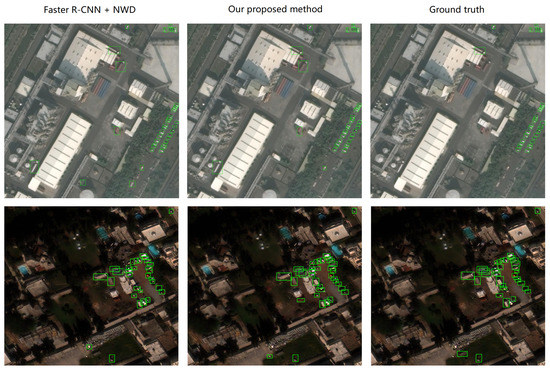 The visualization results of our proposed method and comparison with the Faster R-CNN + NWD detector are shown in Figure 8. From the results, we can see that our proposed method made progress in vehicle detection, especially in vehicle localization. Furthermore, in some dense areas, our proposed method performs well and has a lower missed detection rate. It indicates that when equipped with our method, the anchor-based detector seems capable of handling vehicles in a dense area with overlapped ground truth bounding box. This is a successful use of prior knowledge in vehicle detection.