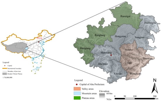 Aba Prefecture covers 84,242 square kilometers, including 13 counties (Figure 1). It features complex geological structures, such as typical valley, mountain, and plateau landscapes. The Aba Prefecture climate reflects the vertical topography with a mean annual temperature of 8.5 °C, and mean annual precipitation of 663.5 mm. Grassland and forest are the dominant vegetation types, accounting for 53.83 and 24.2% of the total area, respectively. According to the Aba Statistical Yearbook [], the study area can be divided into three sub-regions mainly based on complex structure and diverse landforms: valleys (including Wenchuan, Maoxian, Lixian, Heishui counties), mountains (including Songpan, Jiuzhaigou, Jinchuan, Xiaojin, Hongyuan, Maerkang counties) and plateaus (including Rangtang, Aba, Ruoergai counties).