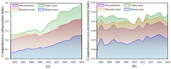 Temporal evolution of (a) comprehensive urbanization index (CUI) and (b) comprehensive eco-environment index (CEI) in Aba Prefecture and each sub-region during 2001~2018 period.