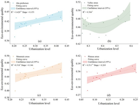 Fitted curves between urbanization level and eco-environmental quality in Aba Prefecture (a) and each sub-region (b–d) during 2001~2018 period. * indicates 95% credible interval; ** indicates 99% credible interval.