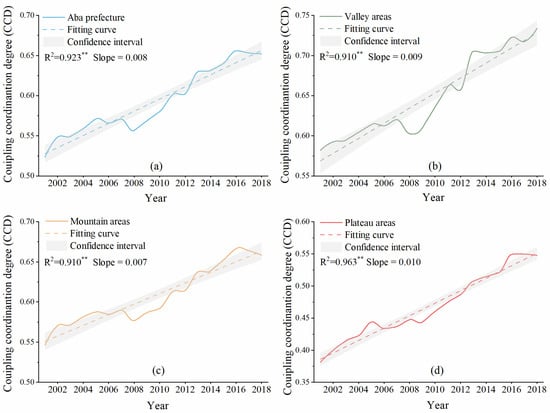 Temporal evolution of coupling coordination degree between urbanization and eco-environment in Aba Prefecture (a) and each sub-region (b–d) during the 2001–2018 period. ** indicates 99% credible interval.