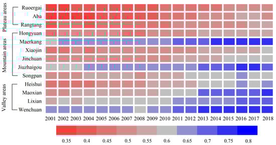 Heatmaps provide not only CCD spatio-temporal changes for each county in Aba Prefecture but also their visibility information (Figure 5). Generally, the color change clearly shows that coupling coordination degree for each county increased gradually from 2001 to 2018, with most CCD scores > 0.5 since 2010. Notably, counties with CCD scores > 0.7 such as Wenchuan (2011–2018), Maoxian (2013–2018), and Maerkang (2014–2018), were mainly concentrated in valleys. Basically, the remaining counties rarely experienced such high CCD scores, especially those in plateau areas.
