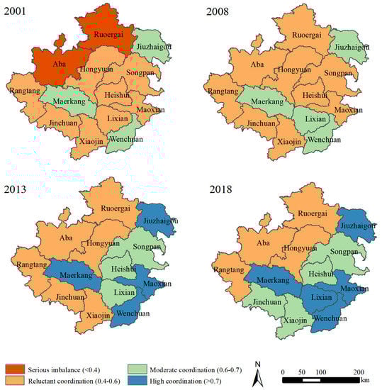 Considering the specific time period of urbanization development in the Aba prefecture, we chose four time nodes (i.e., 2001, 2008, 2013, and 2018) for analyses (Figure 6). For example, the urbanization process was accelerated after China’s western development strategy was launched in 2000, the Wenchuan Ms 8.0 earthquake in 2008, and the post-earthquake reconstruction which was basically completed in 2013. From these important time points, we can understand the coupling coordinated relationship between urbanization and eco-environment in the study area (Figure 6).