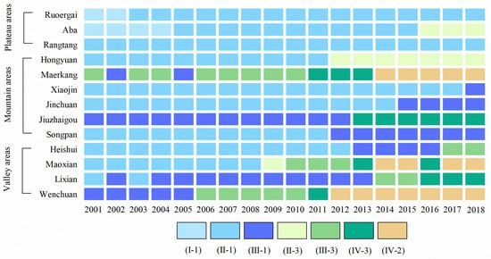 Temporal evolution of coupling coordination types for each county between urbanization and eco-environment in Aba Prefecture from 2001 to 2018. I-1, II-1, and III-1 represent sluggish urbanization with serious imbalance, reluctant coordination, and moderate coordination, respectively. II-3, III-3, and IV-3 represent coordinated development with reluctant coordination, moderate coordination, and high coordination, respectively. IV-2 represents eco-environment lag with high coordination.