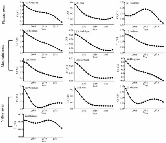 In terms of spatio-temporal distribution, the negative impact of eco-environmental quality on urbanization development is higher in valleys and mountains than in plateau areas. Specifically, the impact of eco-environmental status on urbanization development for valleys, mountains and plateau areas were −0.0025, −0.0054, and −0.0018, respectively. This implies that the eco-environment of Aba Prefecture is not conducive to urbanization. In fact, with reference to Figure 2, CUI only began to overtake CEI in 2018, indicating that urbanization had developed slowly.