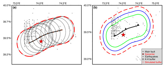 In summary, the fault buffer distance of 39 km is appropriate for M L 7.0– M L 7.1 earthquakes. As shown in Figure 4, the aftershocks within the fault buffer zone are more concentrated and better reflect the correlation between the aftershock sequence and fault strike compared to the aftershocks filtered out by the K-K method.