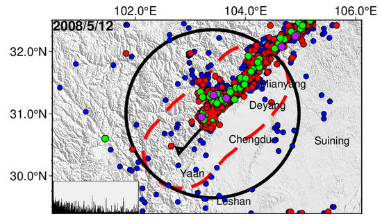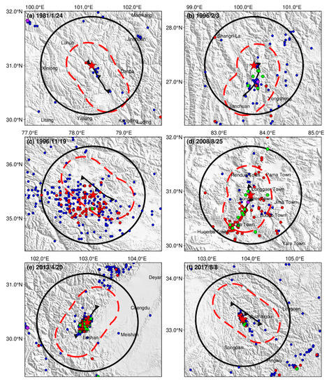 The mainshock in Figure 5d occurred in Zhongba, Tibet, with a generally small aftershock magnitude. The mainshock in Figure 5e occurred in Lushan County, Yaan City, Sichuan Province, which is similar in focal nature to the Wenchuan earthquake (in 2008). In Figure 5f, the mainshock occurred in Jiuzhaigou County, Aba Tibetan Autonomous Prefecture, and the northern Sichuan Province. The aftershocks of this earthquake are characterized by a small number of moderate and strong aftershocks and a large difference in magnitude between the largest aftershock and the mainshock. The sequence of aftershocks showed a NW-SE trend [34].