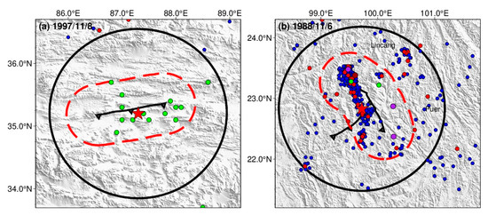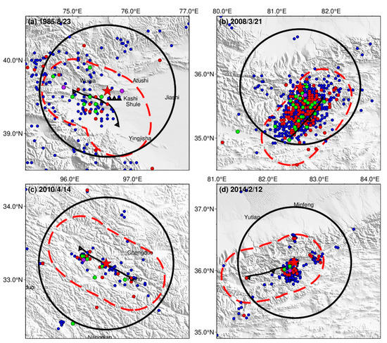 The fault buffer distance of 48 km is suitable for all mainshocks. The mainshock in Figure 6a happened in Wuqia County, Xinjiang Uygur Autonomous Region. The mainshock in Figure 6b is close to the Kunlun Mountain Watershed at the junction of Yutian, Cele, and Tibet. This earthquake is believed to have been caused by a tensile rupture with a strike-slip component of the Guozhacuo fault of the Altyn Tagh fault zone under the action of the NS direction force [30], and the aftershock sequence attenuates quickly, mainly in Tibet, Ritu, and parts of Xinjiang. The mainshock in Figure 6c occurred in Yushu, Qinghai Province, and the largest aftershock magnitude is M L 6.6. The region with the most concentrated aftershocks is located west of the mainshock, and the spatial distribution of aftershocks gradually shrank westward over time [35]. The mainshock in Figure 6d occurred in Yutian, Xinjiang, and its aftershocks are distributed in a southwest direction and spread along one side of the fault.