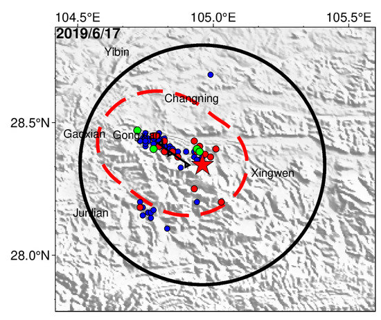 Figure 10. The aftershock deletion of Changning earthquake, Sichuan, China using the fault buffer zone algorithm.