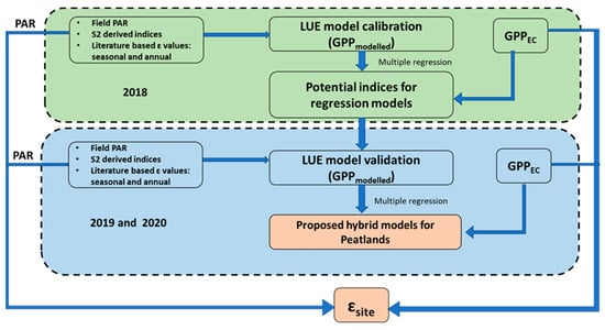 In this study, the hybrid models were developed using three years of data that align with the deployment of the EC tower at this site in 2018, and this work represents a novel attempt to develop hybrid models exclusively for raised bog systems. The proposed Models 2 and 4 in this study performed well with limited remote sensing data for a near-natural peatland and highlights the potential to apply the models developed across raised bogs with different management practices. Furthermore, these models could have utility for other wetland systems and could be tested on blanket bogs, fens, and turloughs, and they could also be used to spatially and temporally upscale GPP models using the site-specific LUE parameter developed here or the literature-based approach of LUE parameter integration.