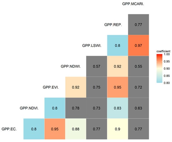 The correlation matrix of modelled GPP with EC-derived GPP for 2018 (red represents stronger positive correlation, blue and yellow represent moderate positive correlation, and grey color shows correlation below 80%).