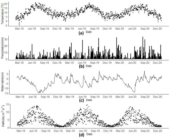The seasonal temporal dynamics of meteorological parameters: (a) Average air temperature (°C), (b) Total daily precipitation (mm), (c) Water table depth (cm), and (d) Total daily PAR (MJ m−2 d−1).