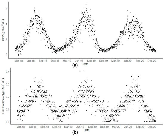 The seasonal temporal dynamics of meteorological parameters: (a) Daily gross primary productivity (g C m−2 d−1) and (b) Light use efficiency parameter (εsite) (g C MJ−1 d−1).