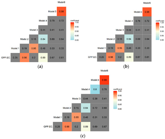 The correlation matrix of modelled and EC-derived GPP for 2019 and 2020: (a) Correlation matrix for ε = 0.61, (b) Correlation matrix for ε = 0.83, (c) Correlation matrix for ε = 1.2 (warmer colors represent stronger positive correlation, cold colors represent moderate positive correlation, and grey color represents correlation values lower than 80%).