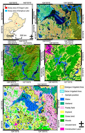 One study area is in the hinterland of the Songnen Plain of Northeast China and is centered on Chagan Lake Nature Reserve (Figure 1a). The long-term annual average temperature and precipitation are 4.5 °C and 450 mm, respectively [41]. According to the current land use classification standard and with appropriate consolidation, the land use types in the study area were divided into surface water types (including rivers and lakes) and non-water types such as wetlands, paddy fields, drylands, woods, grasslands, construction lands, and unused lands (Figure 1c). The water-stable period of this region is from April to June, the high-water period is from July to September, and the low-water period is from October to March of the following year. The Chagan Lake in the center of the study area is the largest inland natural lake in west Jilin Province and is surrounded by various small lakes. These water bodies are located in the saline-alkali soil area and sometimes receive drainage from multiple irrigated areas nearby. Their water quality and volume change significantly with the seasons [34]. The wetland of the marsh is mainly located at the northwest edge of Chagan Lake and Xindian Lake, as well as at the edge of Xinmiao Lake. The main vegetation types of marsh are reed, Phragmites australised, and Typha angustifolia with surface water coverage [42,43]. The paddy fields are mainly distributed in the Qianguo irrigated area located in the east of the region and in the Da’an irrigated area located in the northwest corner of the region, respectively (Figure 1b). Sowing usually begins in the first ten days in April and the seedling transplant begins in mid-May [44]. The vegetation coverage of the paddy fields is low until the beginning of June. Due to the irrigation, the paddy field pixels contain surface water information and appear dark green in Landsat multispectral imagery. During the early growing season, these two land use types may be confused with surface water. Another study area located in the middle of Jilin in Jinlin Province is in the transition zone from the Changbai Mountains to Songnen Plain. The long-term annual average temperature and precipitation are 4.4 °C and 657 mm, respectively. According to the classification standard, the land use types in this study area were divided into surface water types (including rivers and lakes) and non-water types such as paddy fields, drylands, woods and construction lands (Figure 1d). Songhua Lake is in the center of the region. It is a valley lake surrounded by mountains covered with forests. It is also an artificial lake formed after the completion of Fengman hydroelectric power station, and is an important water source in Jilin Province. The water-stable periods of this region are from April to June and from October to November; the high-water period is from July to September, and the low-water period is from December to March of the following year. The water source of Songhua Lake is the upstream of Songhua River, which flows through Songhua Lake and then passes through the urban area of the downtown of the city. The water level and water volume of the lake change periodically during the year. The lowest water level occurs in March and the highest water level occurs in October.