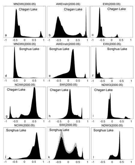 Figure 4. Gray histogram of MNDWI (a,d), AWEInsh (b,e), EWI (c,f), NCIWI (g,j), SWI (h,k) and NDWI3 (i,l) images in May 2000 of the two study regions.