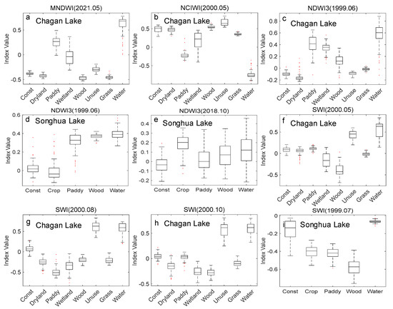 The index images of August 2021 (Chagan Lake area) and 2022 (Songhua Lake area) were selected as an example of the high-water period from July to September, as shown in Figure 3. In the IWS image, only a small part of Chagan Lake and the cloud can be visually recognized, thus failing to identify water (Figure 3l,x). During the high-water period in study area of Chagan Lake, the values of paddy fields and wetlands in most water index images are closer to the non-water land use types covered by vegetation. In the October images of the two years, the values of the paddy fields are also similar to the other non-water types, as shown in Figure 3.