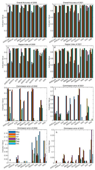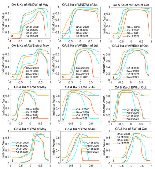 The depth and quality of water bodies, the land use background, and atmospheric conditions are constantly changing throughout the year, which may greatly affect the quality of the imagery as well as the water extraction practices based on them [35]. Nevertheless, few studies have analyzed the characteristics of optimal segmentation thresholds and their dynamics over the course of a year. It is not clear if this dynamic of the optimal threshold has an influence on the water extraction practice. Thus, experiments for different months are necessary in order to analyze the performance of water indices more comprehensively and determine the best water body index and the optimal threshold selection scheme for the region [36,37,38].