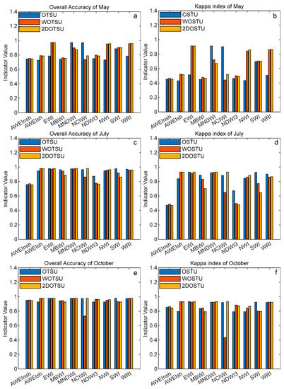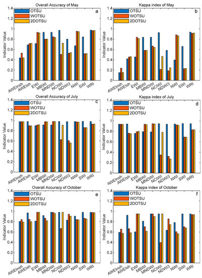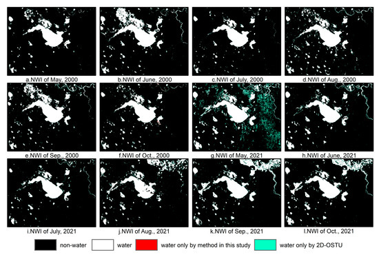 Before applying the OTSU algorithm, the water index images of May, July, and October 2000 were selected for validation. The results were compared with the results obtained by the two-dimensional OTSU (2D-OTSU) algorithm based on a line intercept histogram and a weighted one-dimensional OTSU (WOTSU) algorithm.