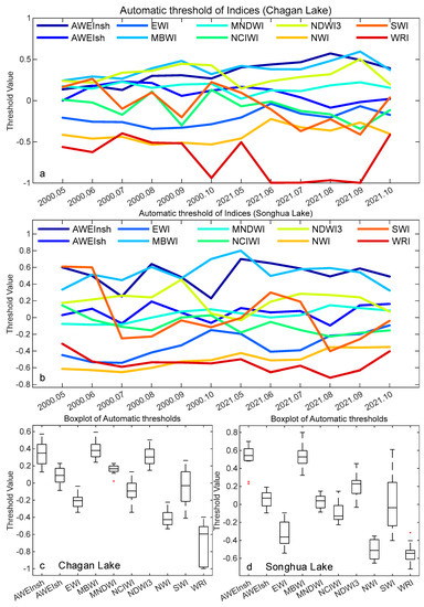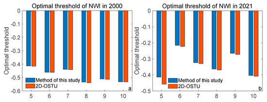 The other key process of the water index method is to set the optimal segmentation threshold, which is more complicated than theoretically expected and may keep changing with time for each imagery, even for AWEI, which is considered to have a stable threshold near 0 [24]. In some studies, the optimal threshold was determined manually through multiple experiments [29]. The process is time-consuming and is easily affected by subjective factors. Several adaptive algorithms extracting the optimal thresholds have also been applied in studies, such as SVM, the geoprocessing model [30], and the widely used OTSU algorithm and its modified forms [31,32]. Yin et al. compared nine automatic thresholding methods and found that the OTSU method was efficient and robust, and could achieve satisfactory results [33]. In some studies, the value of the optimal segmentation thresholds for different indices acquired in the same imagery or the stability of the optimal segmentation thresholds for the same index acquired in different locations or in the same season in different years were compared. For example, Mondejar et al. compared the optimal threshold of NIR band, MNDWI, NDWI, AWEIsh and AWEInsh achieved on a certain day [30]. Sheng et al. checked the robustness of the optimal threshold of a certain index NDWI in different locations in Australia [34].