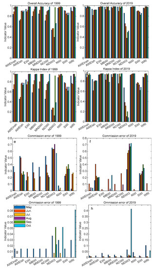The sample points of each land use type in the two study regions were selected according to the actual distribution and the approximate area proportion. The land use types included water, wetland, paddy field, dryland, woods, grassland, construction lands and unused land. The numbers of samples of each land use type are listed in Table 3, and the positions of the reference samples are shown in Figure 1d,e. These samples were used in two respects. On the one hand, the values of the calculated water indices of the sample points were extracted, and the separability of water indices between water and the seven other background non-water land use types were evaluated. On the other hand, the seven background land use types were merged into one type named “non-water” and the samples of non-water type were used together to evaluate the water extraction accuracy based on samples. The water extraction results corresponding to the water and non-water sample points were extracted, and the overall accuracy, Kappa coefficient, commission error, and omission error were employed to quantify water extraction accuracy.