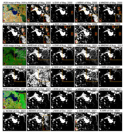 The images acquired in August are usually contaminated by cloud. In August 2021, even though the multispectral image is mosaicked by three different images, there is still a thick cloud with dark shadows in the northeast part of the study area of Chagan Lake. In the WRI image (Figure 3k,w), the values of clouds and shadows are small and consistent with other land use types, indicating that clouds can be effectively suppressed with this index. In other water index images, a clear difference between clouds and other land use types can be observed, and clouds can also be separated from the water bodies to a certain extent. In AWEIsh (Figure 3c,o) and SWI (Figure 3j,v) images, the values of water bodies range between thick clouds and other land use types, rendering it ineffective to separate water bodies by setting only one threshold. With other water indices, the cloud areas have the largest values (Figure 3g,s), the smallest values (Figure 3h,l,t,s), or values between water bodies and other land use types (Figure 3d,f,i,p,r,u), making the water bodies effectively separated by setting one threshold.