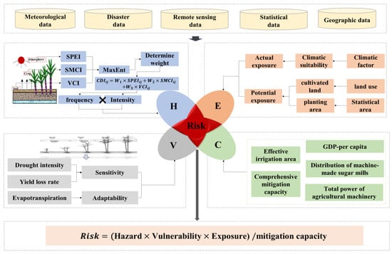 Based on the analysis and zoning of the four risk indicators of the disaster-causing factors, vulnerability and exposure of the disaster bearer, and prevention and mitigation capability for drought disaster of sugarcane in Guangxi, the comprehensive index of drought disaster risk of sugarcane in Guangxi was calculated by coupling the risk mechanism model of natural disasters. The weights of the hazard, exposure, vulnerability, and mitigation capability estimated via the entropy weighting method were 0.3179, 0.209, 0.2245, and 0.2485, respectively.