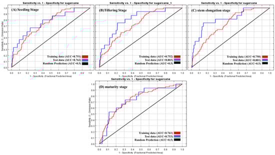 Receiver Operation Characteristic (ROC) curve of the MaxEnt model in the four growth stages of sugarcane. (A–D) refer to the growth stages of seeding emergence, tillering, stem elongation, and maturity, respectively.