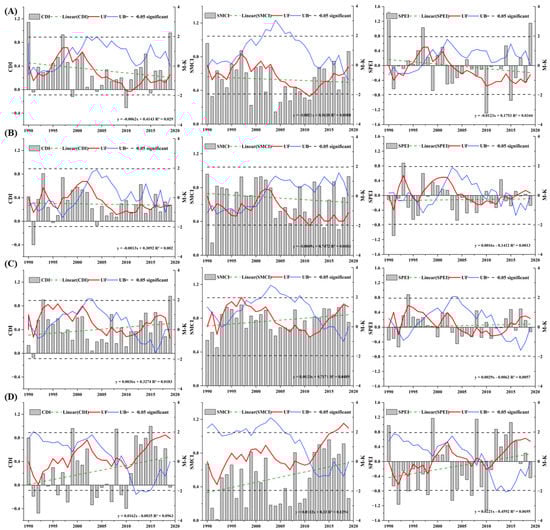 Trends of CDI, SPEI, and soil moisture condition index (SMCI) of sugarcane in Guangxi Province at the different time scales. (A–D) refer to the growth stages of seedling emergence, tillering, stem elongation, and maturity, respectively.