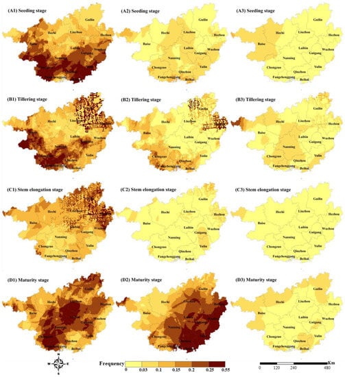 Overall, the frequency of the light drought in southwest Guangxi rose in the seedling stage, whereas the western region was highly prone to severe drought. In the tillering stage, the west, south, and northeast of Guangxi Province exhibited a high incidence of light drought, whereas the drought frequency in the central region was relatively low. The high-incidence areas of moderate drought were mainly concentrated in the northeast and southwest, whereas the frequency of moderate drought in other areas was low. In the stem elongation stage, areas with a high incidence of light drought were mainly concentrated in the northeast. The overall frequencies of the moderate and severe droughts were low (<0.03). In the maturity stage, the high incidence of drought was extensive, and the high incidence of light drought covered the four major sugarcane-producing cities (Chongzuo, Nanning, Laibin, and Liuzhou). The areas with a high incidence of the moderate drought were mainly concentrated in the eastern areas of the study region, including the Cities of Beihai, Wuzhou, Yulin, and Hezhou. The overall frequency of the severe drought was relatively high in the north of the study region and low (<0.03) in other areas.