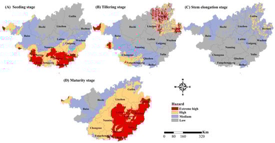 Spatial changes in the drought hazard levels of the four growth stages of sugarcane in Guangxi; (A–D) represent the stages of seedling, tillering, stem elongation, and maturity, respectively.