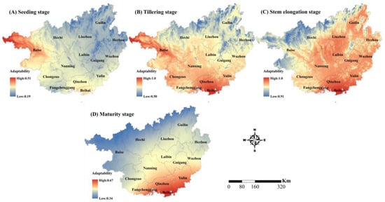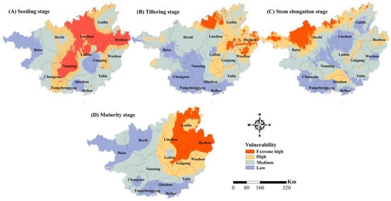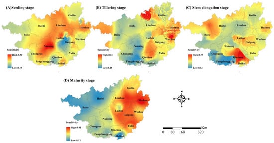 Spatial changes in the drought disaster sensitivity in the four growth stages of sugarcane in Guangxi. (A–D) represent the stages of seedling, tillering, stem elongation, and maturity, respectively.