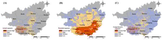 Exposure refers to all life and property that may be at risk of hazardous elements. For sugarcane in Guangxi, the larger the planting proportion was, the greater the potential yield loss was, and the greater the drought disaster risk in the region. The IPCC AR6 clearly stated that the global climate is warming, the temperature in high-latitude areas is rising, and the agro-climatic land suitability of crops is expanding. Sugarcane also has the potential to be planted at high latitudes [47]. Therefore, from the perspective of actual versus potential exposure, this study conducted a comprehensive exposure assessment of drought disaster of sugarcane given not only the current planting area of sugarcane, but also its potential planting range under climate change. The assessment index of actual exposure is the ratio of the actual planting area of sugarcane to the entire cultivated range, and potential exposure is characterized by the climatic suitability of sugarcane.