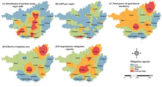 The mitigation capability was used to partly quantify the ability of the disaster-affected ecosystem to recover from it. The regional disaster mitigation capability is inversely proportional to the drought occurrence for sugarcane and closely related to both economic and social factors. This study considered the total power of agricultural machinery, per-capita GDP, distribution of sugar factories, and effective irrigation area. These elements were considered an important basis for reflecting the local mitigation capability. Drought mitigation capability was estimated as follows: