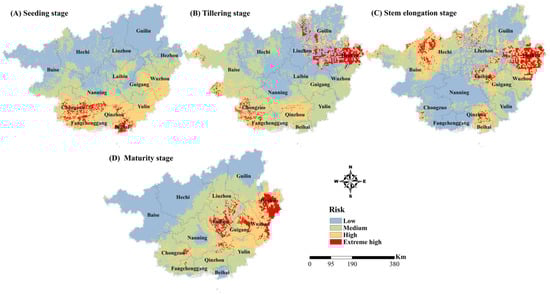 Spatial change in the drought disaster risk of sugarcane in Guangxi. (A–D) represent the stages of seedling, tillering, stem elongation, and maturity, respectively.