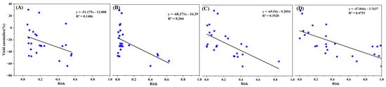 Linear relationship between yield anomalies in the growing season of sugarcane and drought disaster risk in Guangxi. (A–D) represent the stages of seedling, tillering, stem elongation, and maturity, respectively.