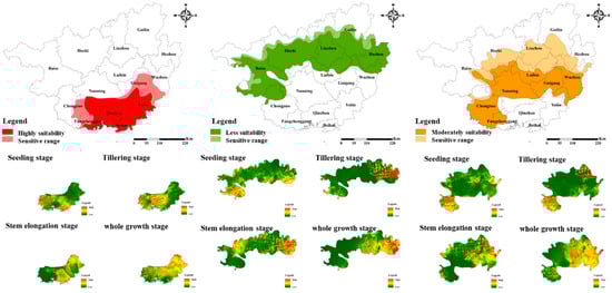 Figure 7 illustrates the zoning map of the drought disaster sensitivity of sugarcane in the four growth stages in Guangxi. As shown in Figure 7, the sugarcane sensitivity showed a distinct spatial difference. In the seedling stage, the sugarcane sensitivity to the mild drought disaster in Guangxi was mainly concentrated in the marginal areas, and the sensitivity value of the Cities of Guigang and Qinzhou reached 0.19, indicating that the sugarcane yield was less adversely affected by the drought intensity in these areas than in the others. The sensitivity of the four major sugarcane-producing cities (Chongzuo, Nanning, Laibin, and Liuzhou) remained relatively high, with the highest value of 0.50, indicating that the potential risk of yield reduction was relatively high in the growth stage during drought. In the tillering stage, the low sensitivity was mainly concentrated in the main sugarcane-producing cities, whereas the high sensitivity was primarily distributed in the west and east. In the stem elongation stage, the sensitivity was distributed along one axis and two wings. Low sensitivity was concentrated in the area from the southwest to the northeast, whereas high sensitivity was scattered on both sides. In the maturity stage, low sensitivity was mainly concentrated in the east, including the Cities of Laibin, Wuzhou, Guigang, Wuzhou, and Hezhou and the southern part of the Liuzhou City. High sensitivity was mainly distributed in the west, including the Cities of Beihai, Fangchenggang, Qinzhou, Chongzuo, Nanning, Baise, and Hechi and the northern part of Liuzhou City.