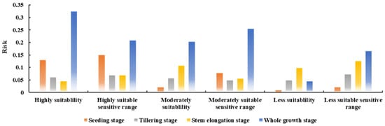 The spatial distribution of the drought disaster risk of sugarcane in Guangxi is shown in Figure 12. In the seedling stage, the risk level decreased from the southwest to the north. The extremely high risks were mainly concentrated in Beihai City in the south of the study region and Chongzuo City in the southwest. The high risks were mainly concentrated in the Fangchenggang and Qinzhou Cities, south of the Nanning and Wuzhou Cities, west of Yulin City, east of Guigang City, and a small part of the Laibin and Liuzhou Cities. The moderate-risk area was mainly distributed in the middle of the study region, including the east of Baise City, the middle of Nanning and Laibin Cities, and at the junction of Wuzhou and Hezhou Cities. The study region was relatively weak in the high-latitude areas. In the tillering stage, the extremely high risks were mainly concentrated in the southwest and northeast of the study region, including the Cities of Chongzuo, Guilin, and Hezhou. The high-risk areas were mainly concentrated in the Qinzhou City, some areas of the Fangchenggang City, and southeast of Baise City. The risk in the central part of the study region was relatively weak. In the stem elongation stage, the extremely high risks were mainly distributed in the Cities of Qinzhou, Laibin, and Hezhou and the west of Hezhou City. Compared with the seedling and tillering stages, in the stem elongation stage, the southwest of the study region became a weak-risk area. In the maturity stage, the extremely high-risk level was mainly concentrated in Chongzuo, Laibin, Qinzhou, Guigang, Wuzhou, and Hezhou. The risks in Baise, Hechi, and Guilin Cities were relatively weak. Overall, Chongzuo, the largest city for sugarcane production, showed a relatively high risk in all the growth stages, except for the stem elongation stage, because the vulnerability of the exposed agricultural ecosystem was a component of this risk. This result showed that a drought disaster may lead to large economic losses.