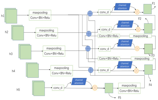 In order to take into account the different receptive fields, a new multi-scale fusion method is proposed and used in our model (Figure 3). In Figure 3, there are 5 inputs and 5 outputs, and F5 is simply convolved through the inputs of 256 × 256 × 32 size to a channel of 64, then multiply it with the output through the channel attention. Figure 3 shows multiple maxpooling modules, where maxpooling does not simply mean a kernel_size and stride but represents different pooling effects on requirements, for example, when generating F3, F4, F5, and h1 and h2 by pooling to 64 × 64, at this time h3 cannot conduct the maxpooling operation. Taking F4 as an example, MSCM first resamples h1, h2, h3, and F5 as 32 × 32, then uses the resampled result to concatenate with h4 and convolve it, adjusting the number of channels to 64; finally, it concatenates it into a 32 × 32 × 320 image and adjusts the number of channels to 64 by conv_d to obtain F4, where conv_d includes the convolution operation, batch normalization, and Relu. The formulas are described as follows: