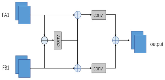 When it is FFM’s turn to work, it will process FA1 and FB1 together. In the processing process, the difference between them will be calculated first, then they will pass through a 3 × 3 convolution and be added to the original input, respectively; finally, they will be convolved separately and then added to obtain the output. The formulas are described as follows: