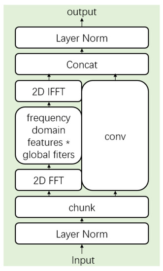 Although the Transformer has been a huge success in computer vision, it has its own problems. Self-attention and MLP have a quadratic growth in complexity, which makes it difficult to scale Transformer-based models when high-resolution features are needed. Because of this, Rao et al. [22] proposed the global filter network in which three key operations replace the self-attention in ViT: a 2D discrete Fourier transform, a multiplication of elements between frequency–domain features and a learnable global filter, and a 2D Fourier inverse transform. It can guarantee the log-linear complexity while calculating the long-term spatial information dependence. They experimentally demonstrate that the global filter effectively replaces self-attention and reduces time complexity.