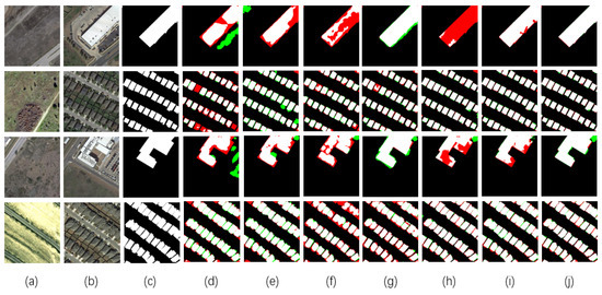 Visualization results of different methods for LEVIR-CD datasets. (a) T1 images. (b) T2 images. (c) Ground truth. (d) FC-Conc. (e) FC-Diff. (f) IFN. (g) DDCNN. (h) SNUNet. (i) BIT. (j) Ours. In the figure, white, black, red, and green represent TP, TN, FN, and FP, respectively.
