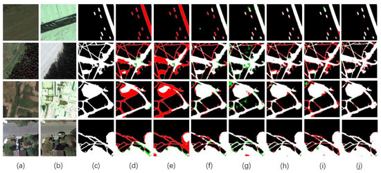 Visualization results of different methods for SYSU datasets. (a) T1 images. (b) T2 images. (c) Ground truth. (d) FC-Conc. (e) FC-Diff. (f) IFN. (g) DDCNN. (h) SNUNet. (i) BIT. (j) Ours. In the figure, white, black, red, and green represent TP, TN, FN, and FP, respectively.