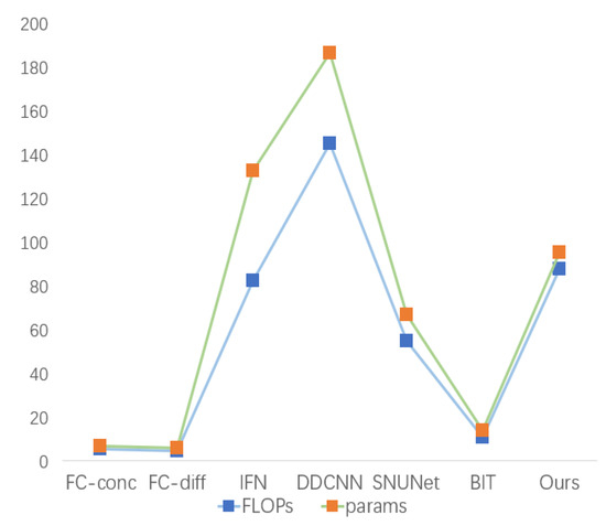 In this paper the FLOPs and params were calculated for different networks at work; Figure 10 illustrates the two parameters in a line graph for different networks. As can be seen from the graph, our FLOPs and params are neither the highest nor the lowest and do not compare favorably with such algorithms as FC-conc and FC-diff, but this cost can be neglected for accuracy improvement. At the same time, our network reduces these two parameters compared to other large models, such as DDCNN, bringing strength to the overall performance.