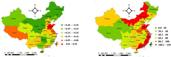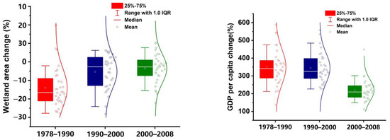 Rates of changes in wetland areas (left) and average GDP per capita (right) in China during the three decades (1978–2008).