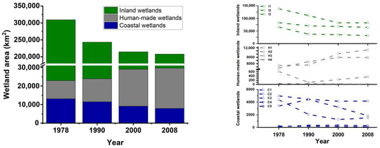 Area of three main wetland types (left) and subtypes (right) in China in 1978, 1990, 2000, and 2008. I1: River wetlands (including floodplains with rivers as river wetlands, landscaping and recreational water bodies, and other wetlands), I2: Lakes, I3: Inland marshes/swamps; H1: Reservoirs/ponds, H2: Artificial channels, H3: Seawater fish farms/salt flats, H4: Other artificial wetlands; C1: Tidal zones/shallow beaches, C2: Marine marshes/mangrove, C3: Estuarine waters, C4: Estuarine deltas, C5: Lagoons.