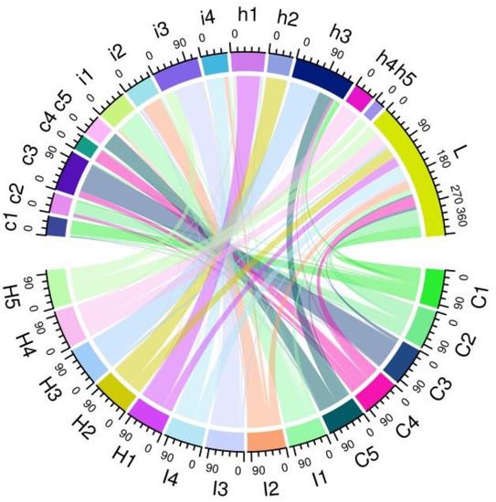 The interchange between different types of wetlands from 1990 (uppercase letters) to 2000 (lowercase letters). I1: River wetlands, I2: floodplain wetlands, I3: Lakes, I4: Inland marshes/swamps; H1: Reservoirs/ponds, H2: Artificial channels, H3: Seawater fish farms/salt flats, H4: Other artificial wetlands; C1: Tidal zones/shallow beaches, C2: Marine marshes/mangrove, C3: Estuarine waters, C4: Estuarine deltas, C5: Lagoons; L: Wetland loss.