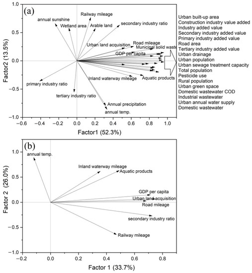The factor analysis based on 29 socioeconomic and three climate parameters shows that two factors can explain 65.8% of the total variation from the data (Figure 5a). Factor 1, which mainly involves urban and industrial development parameters, can explain 52.3% of the total variation. The correlation results show that many socioeconomic parameters have a high correlation with each other (Supplementary Table S2); therefore, VIF values of less than four were applied to avoid linear conjugation to reduce the socioeconomic parameters. Eight parameters were therefore used for further factor analysis. Two new factors can explain 59.7% of the total variation from the data (Figure 5b). Factor 1 (33.7%) is mainly influenced by GDP per capita, the secondary industry ratio, road mileage, and urban land acquisition, while factor 2 (26.0%) is influenced by the annual temperature, aquatic products, railway mileage, and inland waterway mileage. These eight main parameters have rotated loadings (absolute values) over 0.6, and the annual temperature has the highest rotated loading of 0.89 (Table 1). This shows that temperature is the most decisive factor in wetland changes, and socioeconomic parameters play a second important role in China during the study period. Railway mileage has a negative rotated loading (−0.64) on factor 2, which means that it negatively influences changes in wetlands.
