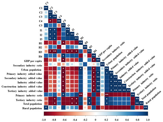 Similarity matrix of wetland types and socioeconomic factors. I1: River wetlands, I2: floodplain wetlands, I3: Lakes, I4: Inland marshes/swamps; H1: Reservoirs/ponds, H2: Artificial channels, H3: Seawater fish farms/salt flats, H4: Other artificial wetlands; C1: Tidal zones/shallow beaches, C2: Marine marshes/mangrove, C3: Estuarine water, C4: Estuarine deltas, C5: Lagoons; significant level: p < 0.05 (*) and p < 0.001 (**).