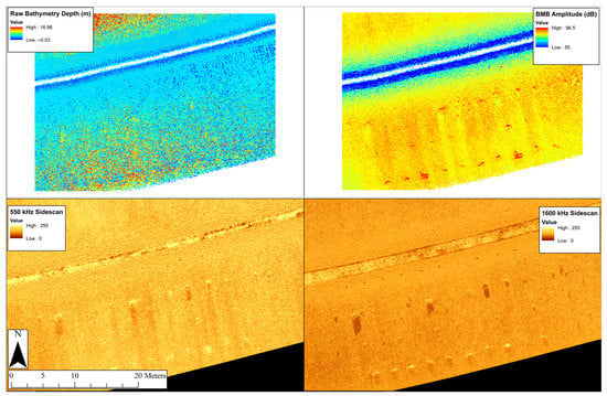 Phase-measuring sidescan sonars (PMSS), sometimes referred to as ‘interferometric’ sonar, phase-measuring bathymetric sonar, or multi-phase echo sounders, use a single transducer element with multiple receiver elements on independent port and starboard arrays [5,18,19,20,21]. This technique allows for the collection of both true sidescan imagery, swath bathymetry, and BMB derived from the bathymetric data set, referred to herein as sidescan backscatter, bathymetry, and BMB, respectively (Figure 1). Borrelli et al. (2021) [5] discussed examples of the first two data sets with the instrument used here. This paper discusses the third data set as it is applied to the DCL of UXO for the ongoing project discussed above.